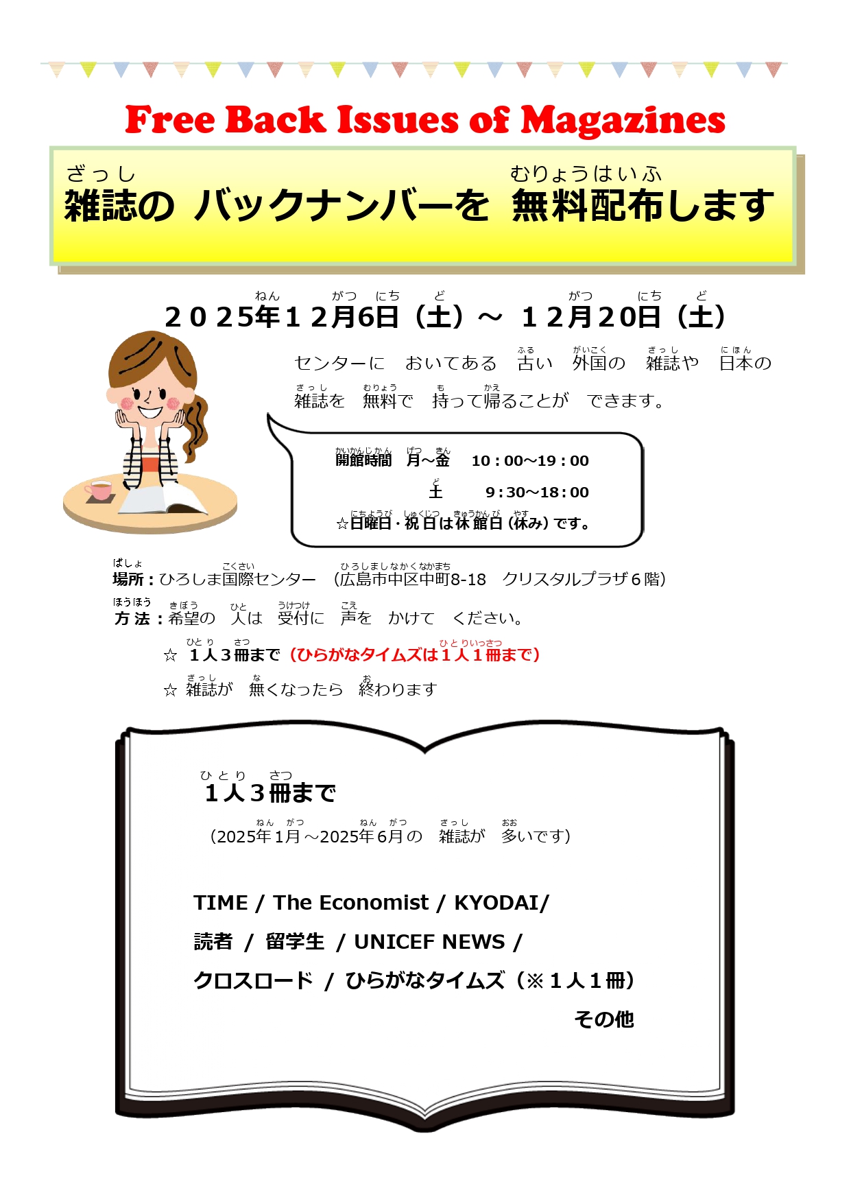 12月6日(土)から 12月20日(土)まで、 センターに ある 古い 雑誌を 無料で 持って帰ることができます。