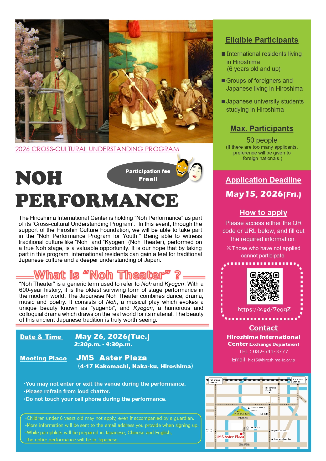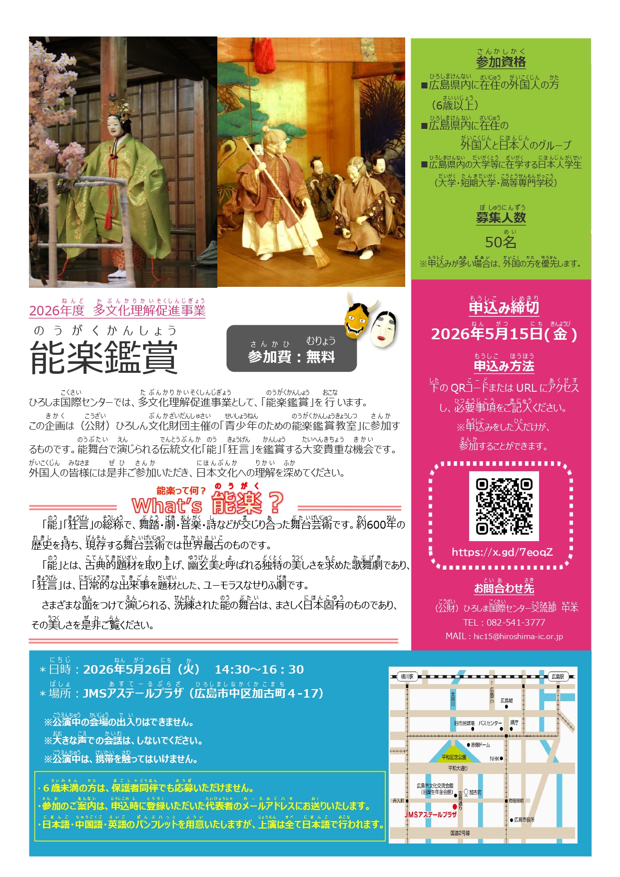 このイベントは(公財)ひろしん文化財団主催の「青少年のための能楽鑑賞教室」に参加するものです。