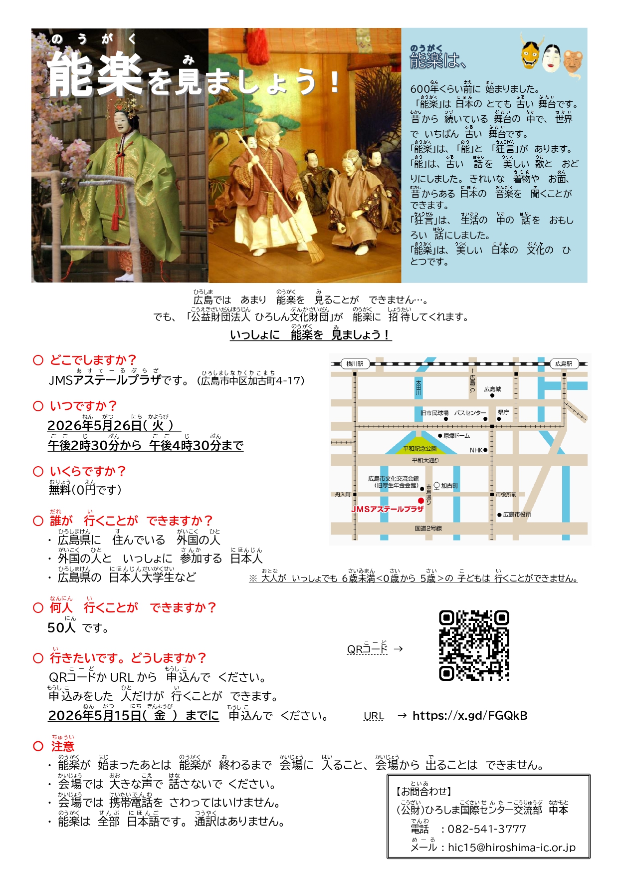 でも 「公益財団法人 ひろしん文化財団」が 能楽に 招待してくれます。